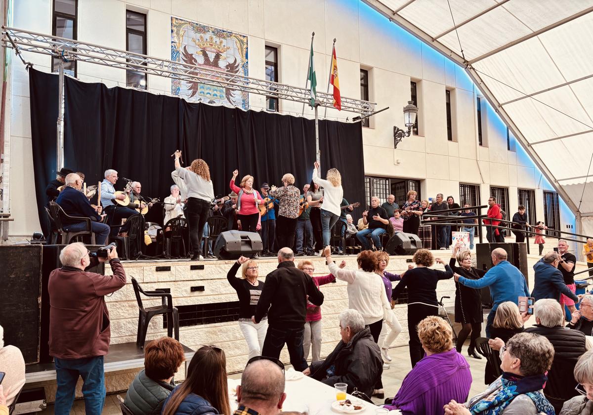 A mediodía, los recién llegados senderistas y el resto de asistentes, se concentraron en el interior de la carpa del Cotillón para degustar embutidos artesanales como aperitivo al tradicional arroz de matanza. Durante la comida, el público disfrutó e incluso algunos bailaron, con el Encuentro de Cuadrillas entre la Cuadrilla Municipal de Pulpí y la Cuadrilla de la Zarzadilla de Totana.