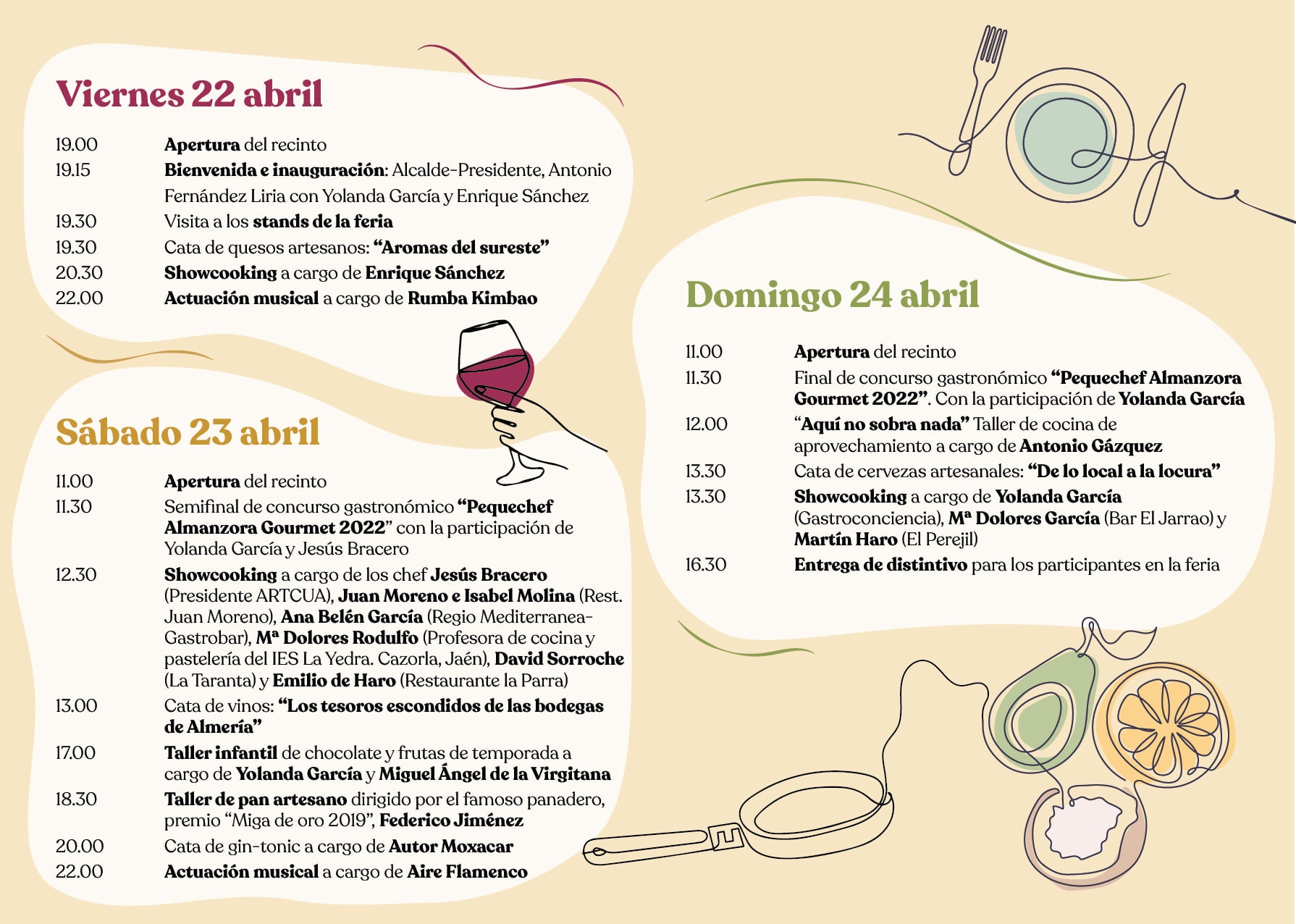 El programa «es para no perderse nada», apuntaban los intervinientes, y está cargado de talleres para los más pequeños, showcookings para todos y catas que nos trae el periodista y crítico gastronómico y miembro de la Academia Andaluza de Gastronomía y Turismo, Curro Lucas, que nos llevarán hasta los 'Tesoros escondidos de las bodegas de Almería' pasando por cervezas que irán 'De lo local a la locura' y quesos que nos deleitarán con 'Aromas del sureste'. Igualmente, se ofrecerá una cata de gintonic a cargo de la empresa De Autor Moxácar-Glamour Arena.