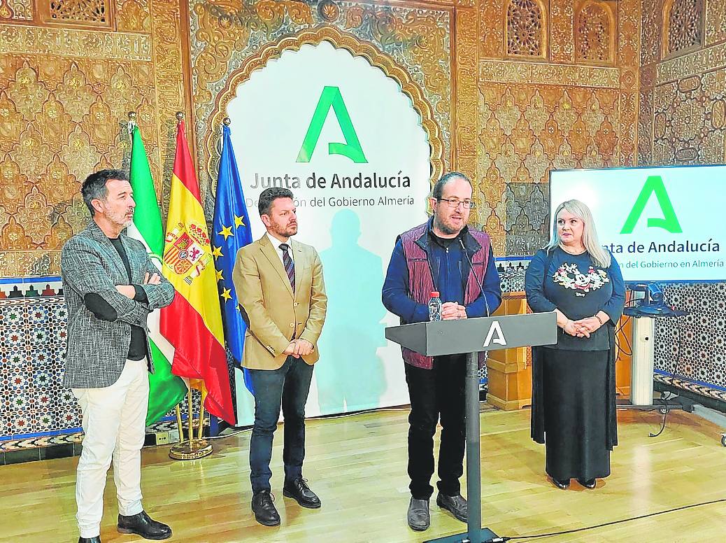 El delegado territorial de la Consejería de Turismo, Cultura y Deporte, José Ángel Vélez, la concejal de Cultura del Ayuntamiento de Níjar, Yolanda Lozano Salinas, ... el presidente de la Asociación de empresas de servicios turísticos del Parque Natural Cabo de Gara- Níjar (Asemparna), Francisco Jesús García, han presentado, junto al artista Andrés Garía Ibáñez, el taller de pintura que se va a desarrollar en el Parque Natural Cabo de Gata Níjar del 19 al 23 de abril.