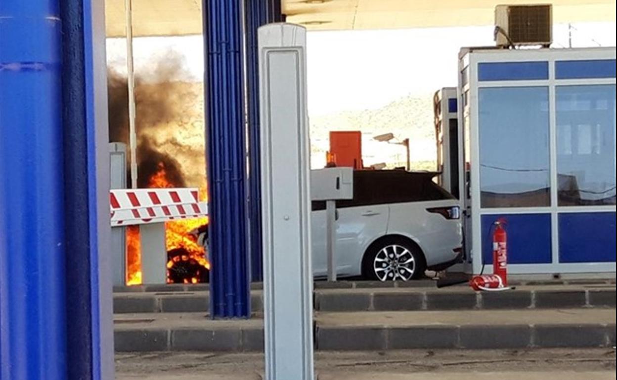 Bomberos trabajan en la extinción de un vehículo incendiado en el peaje de la A-7, a su paso por Vera