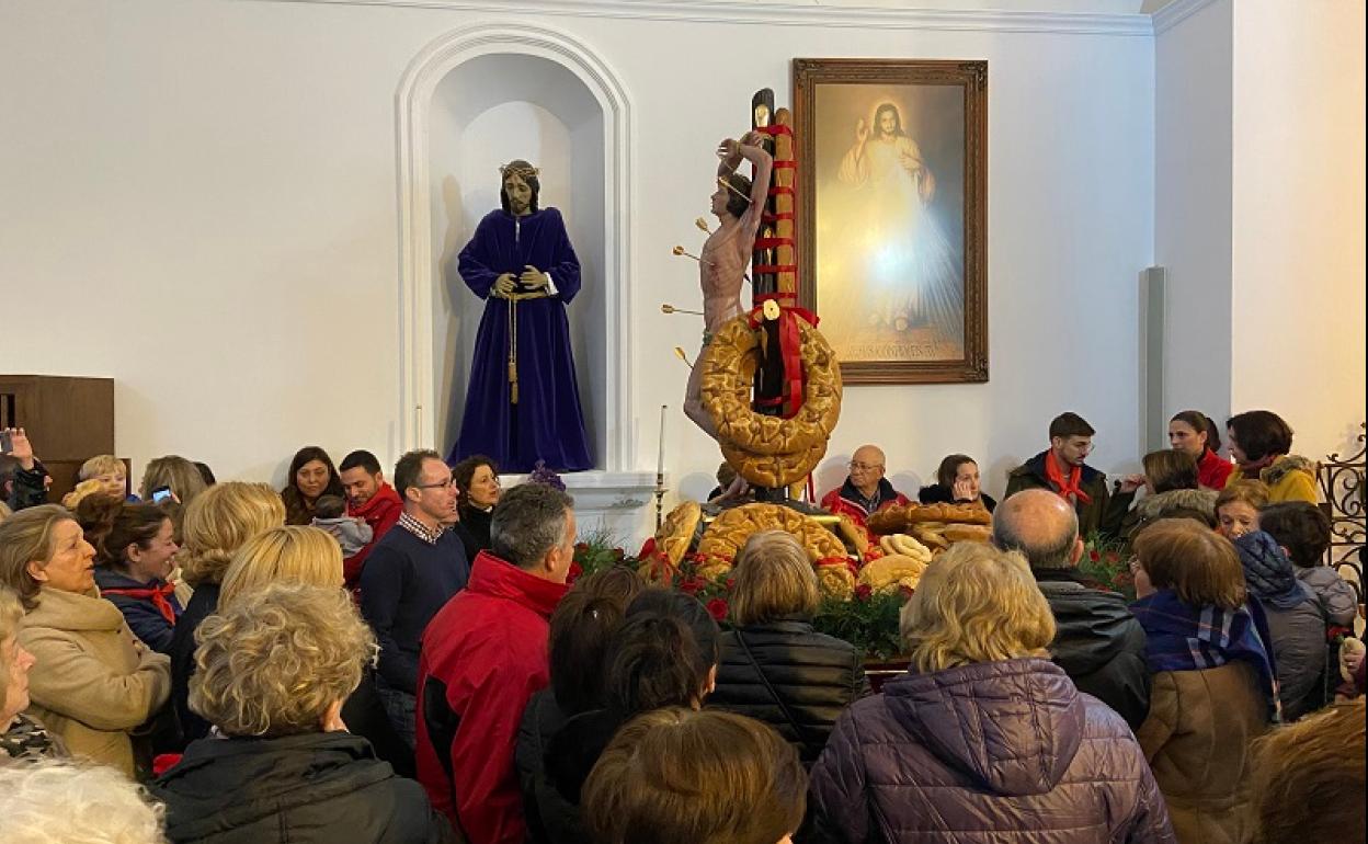 Durante la solemne misa en honor al Patrón, los allí presentes han orado para que el temporal les permitiera al menos procesionar al Santo, puesto que con las calles mojadas hubiese sido peligroso lanzar los tradicionales roscos de San Sebastián.