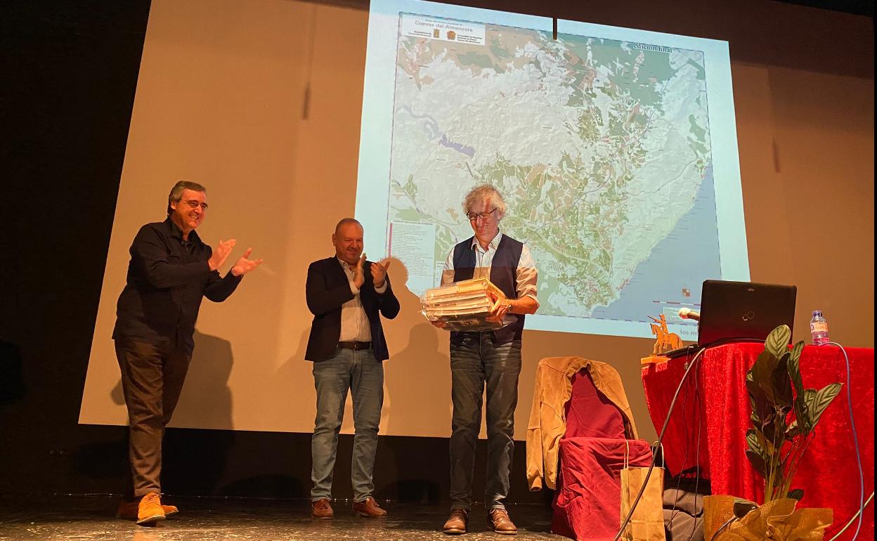 El alcalde cuevano Antonio Fernández agradeció a Caparrós su gran trabajo y su generosidad. Además agradeció a la comunidad de regantes de Cuevas su colaboración para la impresión de más de 250 mapas para entregar a los asistentes a la presentación.
