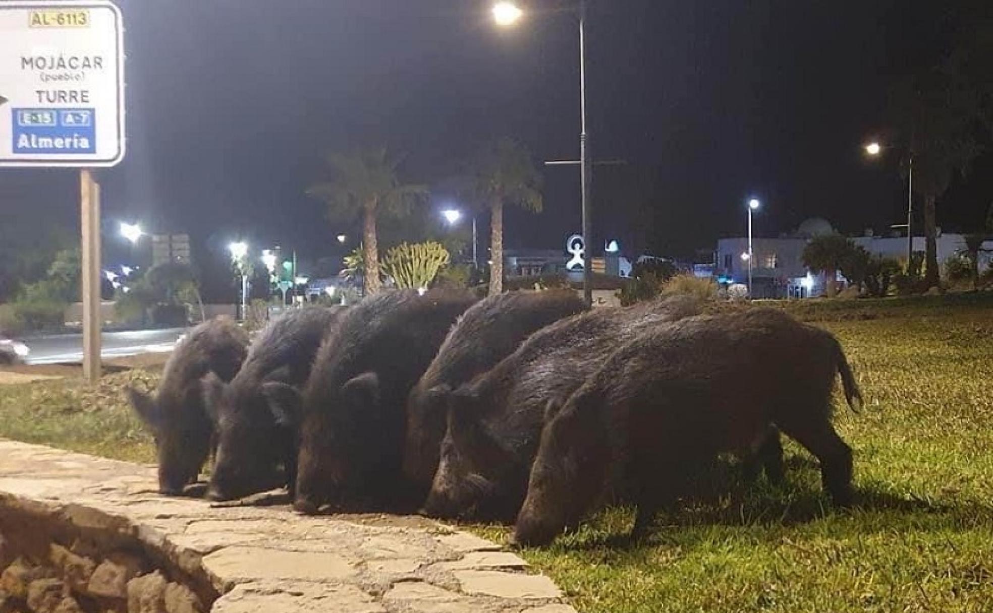 En Mojácar ya es algo habitual ver de vez en cuando a un grupo de jabalíes paseando por las calles de la localidad aprovechando la tranquilidad de la noche. Este pasado fin de semana ha vuelto a suceder, al menos seis jabalíes han estado deambulando por las inmediaciones del Parque Comercial de Mojácar, la misma zona en la que antes del confinamiento de marzo, un conductor embistió a uno de estos animales y que posteriormente fue identificado por los agentes del Seprona de la Guardia Civil.