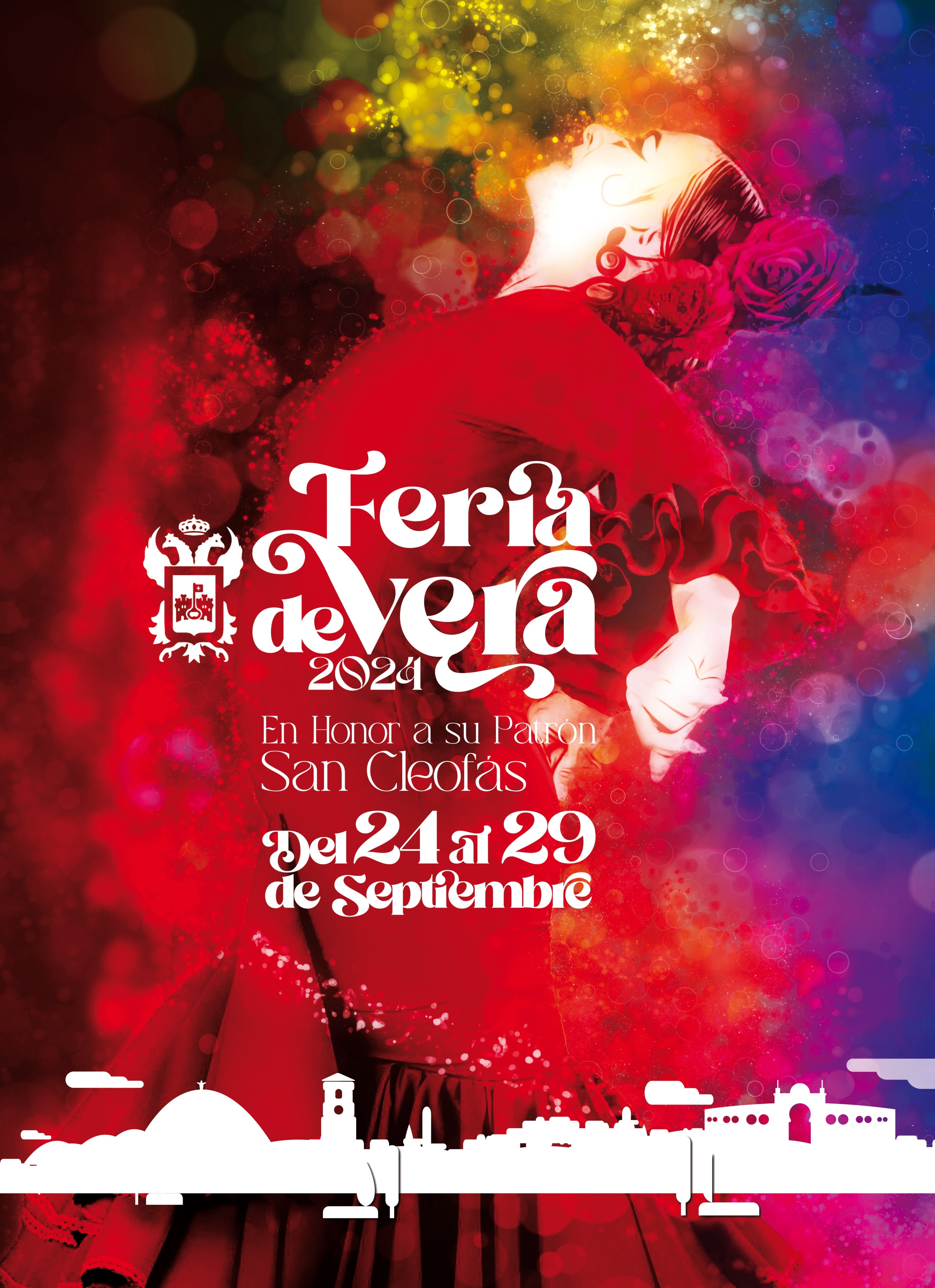 El cartel anunciador de la Feria de Vera 2024 es obra del reconocido artista, diseñador gráfico e ilustrador José Ramón París Piñero, propietario de la galería y sala de exposiciones Cuatro Caños, quien explicó durante la presentación que «la imagen de las Fiestas Patronales está inspirado en la propia Vera, principalmente en cuatro elementos compositivos: en su gente, en su historia, en su tradición y en la energía que se respira en cada rincón durante las Fiestas. Vera con su luz, siempre ha sido para mí fuente de inspiración. La bailarina flamenca en el centro, en el corazón de una explosión de colores, simboliza la alegría, la pasión y luminosidad que caracterizan nuestras fiestas. Los colores vibrantes potencian la energía y el dinamismo de esta composición. Los círculos luminosos representan esos momentos especiales que vivimos juntos, los abrazos, las risas los recuerdos agradables que creamos año tras año.