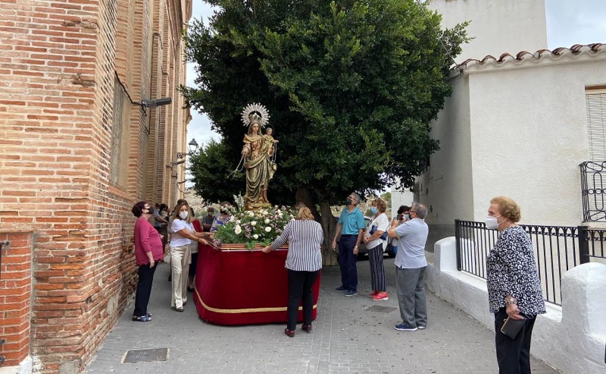 Tras la misa oficiada en la Iglesia, respetando las medidas de seguridad, se ha procedido a la procesión de la Virgen del Rosario por las calles de la localidad. Una treintena de personas han acompañado a la imagen de la patrona por las calles de la localidad.