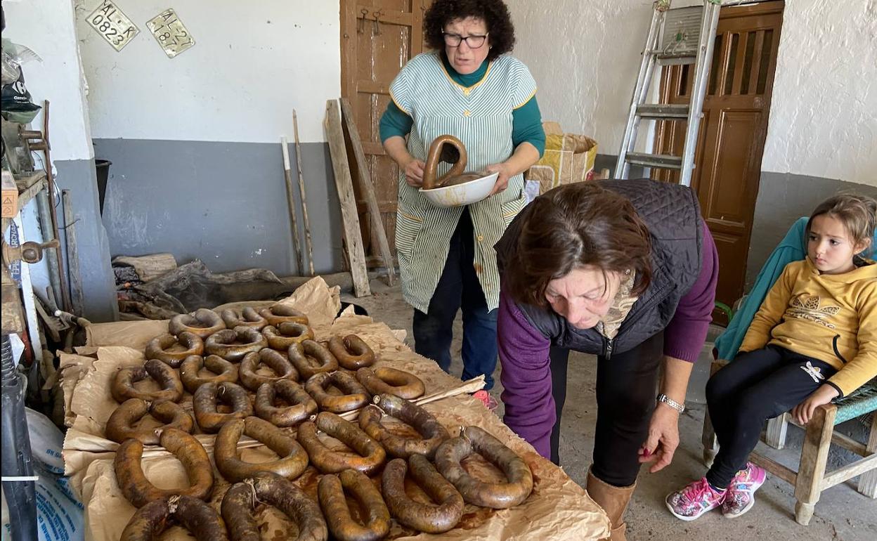 Cuando le preguntan por el procedimiento a seguir, Pedro explica que entre los hombres de la familia ponen al cerdo en el banco para sujetarle las patas, y es entonces cuando el matarife hace su trabajo. Mientras tanto, su hija María recoge la sangre que derrama el animal en un barreño, removiendo para que no se coagule y quede inservible. Esta sangre se emplea el segundo día para elaborar la masa de las morcillas compuesta por arroz, cebolla, almendras, pimientos, especias y la grasa del cerdo; y también para la butifarra. «Depende del pueblo, incluso de la casa en la que preguntes, los ingredientes de las recetas para elaborar las morcillas pueden variar».