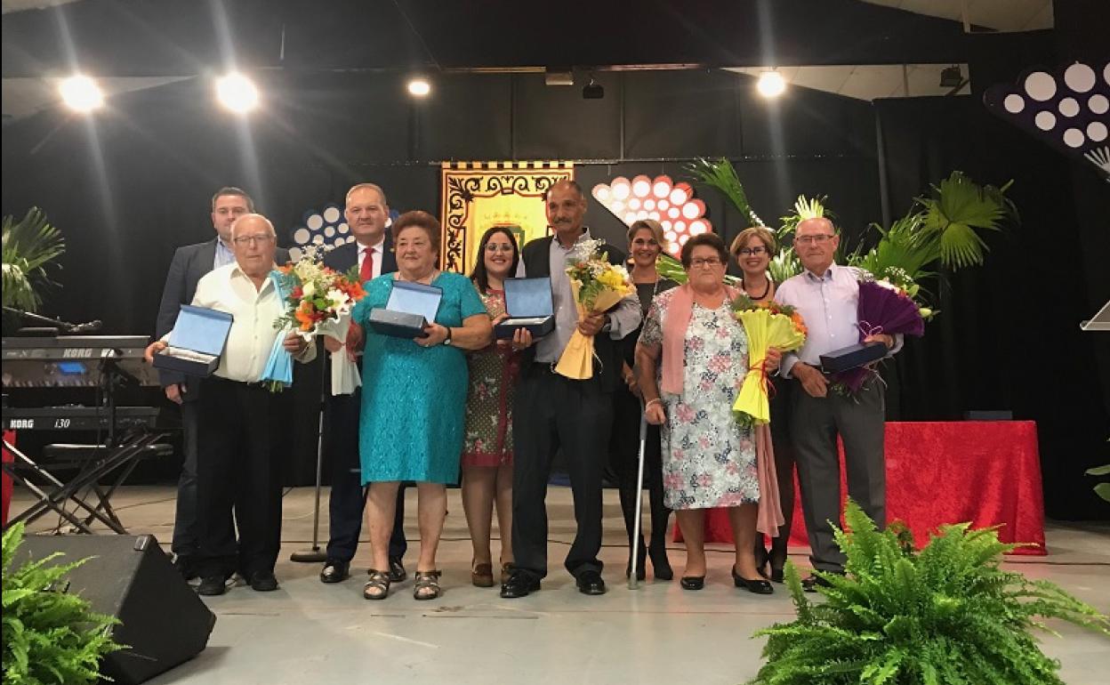 Esta comida homenaje acogió el acto de entrega de cinco placas conmemorativas a cinco personas mayores del municipio, en reconocimiento a unas vidas llenas de esfuerzo, trabajo y dedicación a su pueblo. El Alcalde Antonio Fernández y la edil de Festejos Isabel Mª Haro fueron los encargados de hacer entrega de estas distinciones a Dionisia Rodríguez de Haro, Damiana Zamora Toledo, Fernando Martínez Rodríguez, Luis Santiago Fernández y Andrés González García.