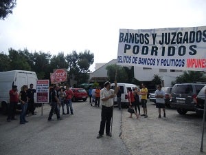 Nadie se lo había comunicado de forma oficial, pero sabían que ayer sobre las diez y media de la mañana llegarían desde el juzgado a efectuar el desahucio. Manuel Jiménez, un cartagenero que lleva más de treinta años trabajando en la zona del Levante, y Ausra Klikunaite, de nacionalidad lituana, estaban visiblemente nerviosos y afectados porque consideran que era un desahucio "totalmente ilegal", ya que ellos disponen de "un contrato con la promotora Ingofersa, por la que ésta alquila el restaurante y las viviendas de la finca, con más de 5.000 metros cuadrados, durante cinco años por un precio de 180.000 euros" al matrimonio. Allí viven ellos con sus hijos y dan trabajo a otras cuatro personas. Ayer esperaban la ejecución de la orden de desahucio, a pesar de que no tuvieron comunicación oficial, según explican, "tal y como pasó en febrero". En aquella ocasión, finalmente no se procedió al desalojo, pero esta vez sí. Aunque aseguran que no se van a marchar y se quedaron en la puerta del restaurante El Gnomo Feliz de Vera, junto a una treintena de personas más, entre amigos y clientes que se resistían también, de forma pacífica, al desahucio, con carteles y pancartas en las que señalaban a los que consideran los culpables de esta situación: 'Stop desahucios', 'Bancos y juzgados podridos. Delitos de bancos y políticos impunes', 'Estafa, miente y deja a cinco familias sin trabajo'. Ante la negativa primera, sobre las once de la mañana de marcharse, acudieron alrededor de media docena de agentes de la Guardia Civil, que dialogaron con Manuel y su esposa, aconsejándoles que abandonaran el lugar porque el desahucio ya estaba sentenciado. A las doce se les comunicó que tenían una hora para llevarse lo que quisieran y a las 13 horas se procedió al desalojo. Sacaron coches, algunas provisiones y helados para 'refrescar' el mal trago de los que acompañaban a la familia y unas pocas pertenencias más, pero se resistieron a dejar lo que era su casa y su negocio y se quedaron a las puertas del mismo. "No tenemos dónde ir, así que estaremos aquí", aseguraba Jiménez, un hombre de Cartagena que lleva treinta años en el Levante de Almería trabajando; su mujer, una lituana que portaba consigo toda la documentación del establecimiento, de sus licencias, del contrato de alquiler, de la demanda que han interpuesto al banco y al juzgado, y que se quejaba de que "no nos han querido escuchar, la jueza no ha aceptado nuestra documentación porque aseguraba que estaba fuera de plazo, hubo un juicio el 2 de abril en el que no pudimos mostrarle todos los documentos, no los aceptó y no entendemos por qué".