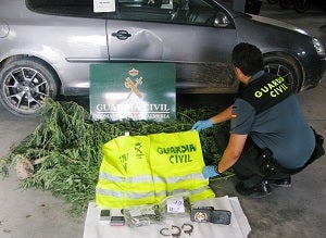Durante el registro superficial del maletero observaron la presencia de dos chalecos reflectantes con distintivos y la inscripción "GUARDIA CIVIL", así como dos carteras porta placas de la misma naturaleza, un pasamontañas y un par de botas de las utilizadas para motocross, todo ello entre algunos restos de lo que parecía marihuana. Tras la identificación se intervinieron los chalecos dejándoles en posesión del resto de objetos al ser de lícita procedencia.