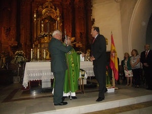 La Hermandad de San Juan y el Cristo de la Misericordia de Vera vivía ayer un «día grande» según explicaba su Hermano Mayor, Diego Núñez, al proceder a la entrega del báculo, guión y medallas al benemérito cuerpo de la Guardia Civil de Vera, después de que en mayo se le otorgara al mismo el título de mayordomo honorífico. En estos símbolos se contemplan los escudos de la Hermandad de San Juan y de la Guardia Civil, «unidos por la cruz del Cristo de la Misericordia y rodeados de la corono de espinas», en las medallas, «los colores verde y rojo, entrelazados», y como testigos de este acto de estrechar los lazos entre Guardia Civil y Hermandad, la Virgen del Pilar, y las imágenes de San Juan Evangelista, María Santísima y el Cristo de la Misericordia.