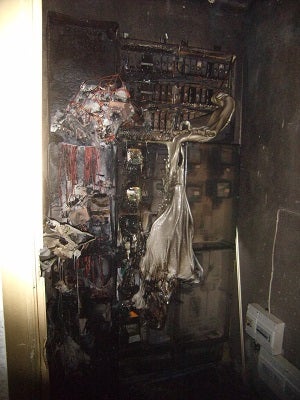 Después de la extinción del mismo, se procede a la extracción del humo que ocupaba todo el hueco de escaleras y posteriormente los vecinos vuelven a sus domicilios teniendo en cuenta que sin electricidad, ya que el cuadro de contadores estaba totalmente calcinado.