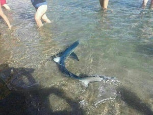 Una cría de tiburón se acerca a una playa mojaquera, los bañistas la ayudan a volver a alta mar