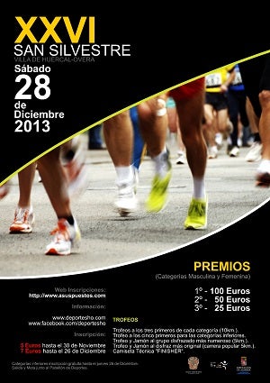 Las inscripciones deberán hacerse en la página web: www.asuspuestos.com, rellenando el formulario y efectuando el pago por transferencia o tarjeta de crédito, o ... bien a través de la página web de la Concejalía de Deportes www.deportesho.com desde donde se podrá acceder también a la Inscripción de la prueba a través de los enlaces habilitados hasta el portal de asuspuestos.com Se han establecido varios premios en metálico en la prueba de 10km: 1º MAS/FEM 100 ? 2º 50 ? 3º 25 ? Y trofeos a los 3 primeros de todas las categorías en 10 Km. En la prueba de 5 kilómetros habrá trofeo y jamón al grupo disfrazado más numeroso (popular 5km) y trofeo y jamón al disfraz más original ( carrera popular 5km) Todos los participantes que finalicen las pruebas de 5 y 10 kilómetros recibirán una camiseta conmemorativa de la prueba. El concejal de Deportes, Alonso Mena, detalló que "volvemos apostar por esta popular carrera que congrega a tantos atletas en nuestro municipio y lo hacemos dándole un mayor atractivo a la vez que dando por supuesto la oportunidad a nuestros niños de que participen" Además de los 5 y 10 kilómetros se llevará a cabo la prueba en categorías inferiores desde prebenjamín hasta cadete con un recorrido que va desde los 400 a los 1200 metros. La inscripción en esta categorías es gratuita. Estas categorías comenzarán a las 16:00 horas y la prueba en 10 y 5 kilómetros a las 17:30 horas. La salida y meta se realizarán en la explanada del recinto ferial, junto al Pabellón de Deportes, en donde habrá aseos, duchas y vestuarios a disposición de todos los participantes. Habrá una zona habilitada de parking para los participantes de la prueba junto a la salida y meta.