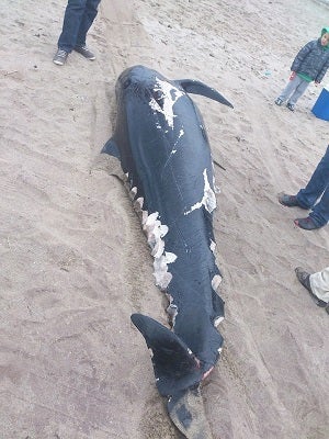 Según comentan en su página acompañando las fotos de Juan Pablo Fernández, el animal 'tiene muchos mordiscos por todo su cuerpo; biólogos expertos han ... dicho que posiblemente haya sido atacado por algún tiburón'.