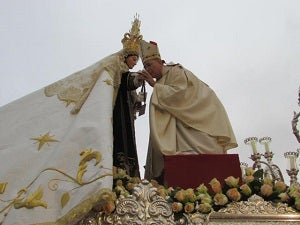 Todos miraban al cielo cuando tras la presentación de las 40 hermandades a la Virgen las puertas de la iglesia, cayeron las primeras gotas. Después ... de unos minutos de incertidumbre la decisión fue seguir con el evento preparado, así que salió la corona de la parroquia, portada por los más pequeños, seguidos de la Virgen a hombros de los costaleros, en dirección al altar preparado en la plaza de la Libertad, frente al Castillo, donde ya esperaban miles de personas y grandes autoridades religiosas, militares y civiles. La coronación canónica de la Patrona y también la del Niño la llevó a cabo el obispo de Almería, Adolfo González Montes, en el desarrollo de una misa que ofició junto a una decena de sacerdotes y el párroco cuevano Antonio Ramón Salvador.
