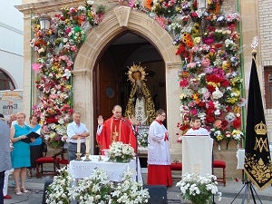 A su término siguió la Misa de Campaña, presidida por el párroco Carlos María Fortes García, que contó con la actuación del Coro Parroquial de ... la Encarnación y San José, y a continuación, la imagen de la excelsa patrona fue, trasladada hasta el templo parroquial de la Encarnación, portada por miembros de la Hermandad y fieles devotos que solicitaban animadamente situarse bajo los varales del trono que porta a la Virgen de las Angustias.
