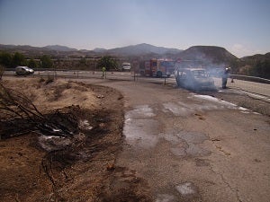 Los bomberos del Levante se trasladaron este lunes hasta Sorbas para sofocar un fuego declarado en un coche averiado. El siniestro, sin daños personales, se produjo en el kilómetro 9.6 de la carretera AL-1102, a la altura de la salida 504 de la autovía A-7 (Gafarillos-Sorbas). Los efectivos sofocaron las llamas de una furgoneta que, por razones que se investigan, quedó totalmente calcinada en cuestión de segundos. La intervención de los bomberos evitó que las llamas se propagaran a una zona próxima habitada por pinar, si bien el fuego arrasó una pequeña cuadrícula de matorral situada junto a la carretera.