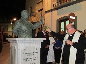 La escultura de Antonio Carmona ‘brinda’ en Vera desde la plaza que lleva su nombre