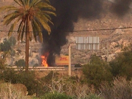 Efectivos del Cuerpo de Bomberos del Levante sofocaron en la tarde del pasado viernes el incendio originado en un camión articulado de una empresa de mensajería que circulaba por la autovía A-7, en dirección a Murcia y a la altura del municipio de Huércal-Overa. Los hechos se produjeron en torno a las 20.11 horas. El Parque de Bomberos del Levante recibía varias llamadas de particulares alertando de las llamas y el extenso humo que desprendía un camión parado en la autovía A-7, concretamente en el punto kilométrico 547. Hasta el lugar se desplazaron vgaviarias patrullas de la Guardia Civil, que tuvieron que cortar el carril de la autovía por motivos de seguridad, y varias dotaciones de bomberos, quienes consiguieron apagar las llamas que se desprendían del remolque y la cabina. Afortunadamente no hubo que lamentar heridos, ya que el conductor, único ocupante del tráiler, pudo salir por su propio pie.