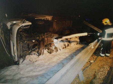 El conductor de un camión resultó herido esta madrugada tras tener un accidente con su vehículo. Bomberos del Levante tuvieron que acudir también al lugar del siniestro, donde sobre las 4 de la madrugada, por causas que aún se desconocen un tráiler se salía de la vía, la A7 en el kilómetro 525, en término municipal de Los Gallardos, quedando completamente volcado lateralmente y produciendo un derrame de gasoil que tuvo que ser controlado con espuma por parte de los bomberos.