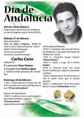 El Ayuntamiento de Cuevas del Almanzora, a través de la Concejalía de Cultura y Turismo, ha preparado este año un amplio programa de actividades para celebrar el Día de Andalucía. Los actos comenzarán el viernes 26 a las 20:00 horas con un ciclo de proyecciones sobre el Día de Andalucía en el Cine Teatro Echegaray. A este le seguirá el Concierto-recital homenaje a Carlos Cano "A la luz de sus cantares" que tendrá lugar el sábado día 27 en el Cine Teatro Echegaray a partir de las 20:00 horas, con el cantautor Paco Damas, el guitarrista Carlos López y la narración de personas de la localidad.