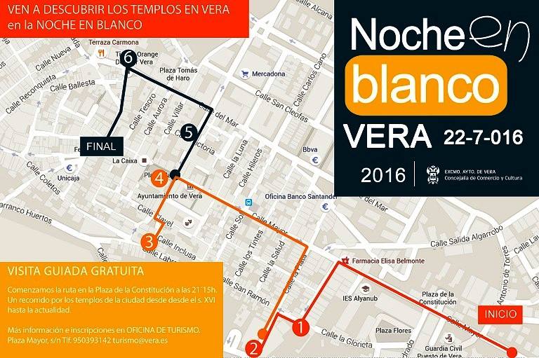 Por otra parte, la Noche en Blanco de Vera se complementa culturalmente con la Ruta de los Templos, una visita guiada y gratuita que comenzará a las 21:15 horas en la plaza de la Constitución y que efectuará un recorrido por los templos de la ciudad desde el siglo XVI hasta la actualidad.