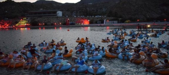 En esta ocasión, no fueron 'dragones' ni embarcaciones las que se 'colaron' en este 'lago' artificial, sino cientos de flotadores y de sensaciones, al sentir la acción de la pantalla, alrededor de uno, tanto si eran tiburones como explosiones. Todo ello vivido sobre un flotador, en el agua, con los pies sumergidos (el más atrevido) y en bañador.