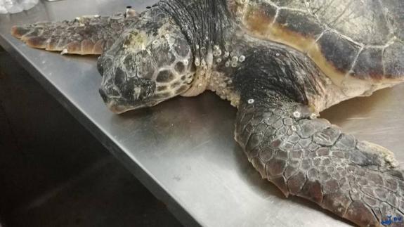 Se trata de una tortuga boca de apenas 50 centímetros que presentaba los ojos completamente hinchados, alta carga parasitaria de cirrrípedo y una fuerte infección generalizada. Los miembros de Equinac la trasladaron rápidamente y llevan más de 24 horas tratando clínicamente al animal, pese a que su estado es crítico, según ha trasladado a este periódico Eva María Morón, coordinadora de Equinac.