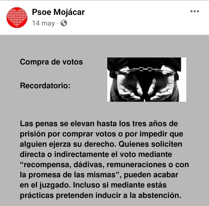 El pasado 14 de mayo, diez días antes de que los agentes procedieran a las detenciones, el PSOE de Mojácar publicó en su perfil de Facebook un «recordatorio» sobre la compra de votos.