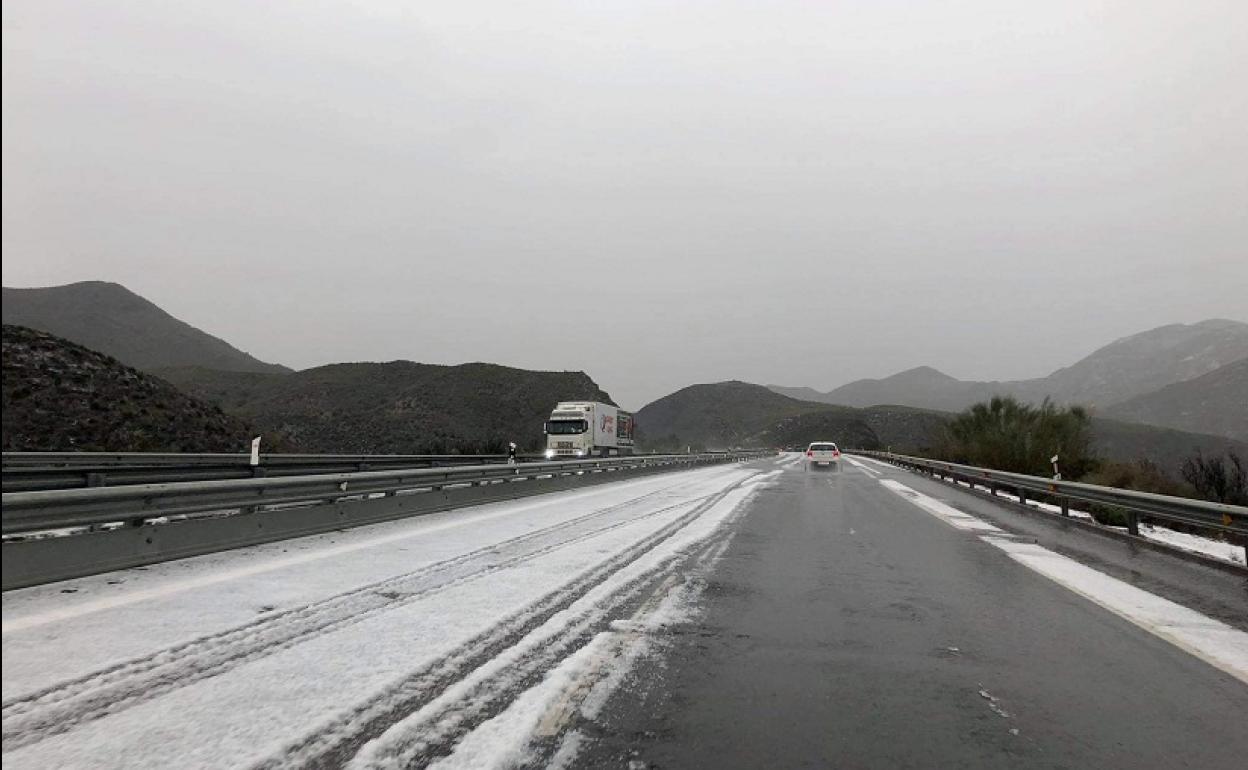 En pocos minutos han sido testigos de como la calzada ha quedado cubierta de blanco, como si se tratase de un municipio serrano en Navidad. La Agencia Estatal de Meteorología (Aemet) ha decretado un aviso amarillo para las comarcas del Levante Almeriense, el Valle del Almanzora, Los Vélez, Campo de Tabernas y Nacimiento.