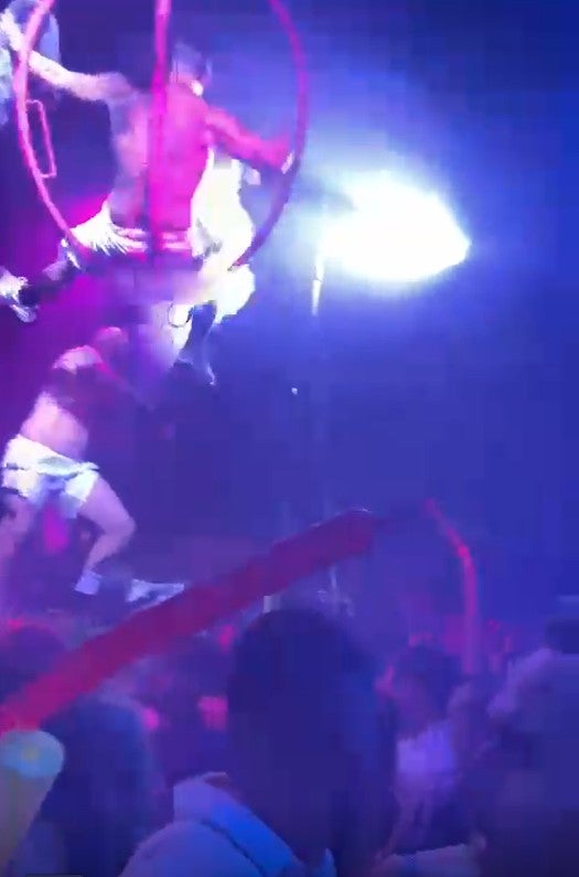 La pista de baile al completo, la música a todo volumen. Mientras baila y bebe, la multitud dirige la mirada hacia arriba, hacia un animado ... joven que se balancea en un columpio suspendido en el aire. Es todo un espectáculo digno de celebrar. Nadie lo espera pero, de repente, el balancín se desploma y cae sobre quienes se encontraban justo debajo de él.
