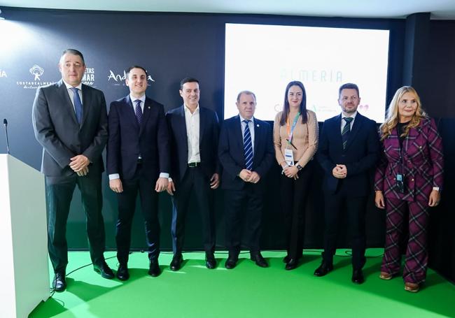 En la puesta de largo en el escenario de 'Costa de Almería' del Pabellón de Andalucía en Fitur, han participado el presidente de la Diputación, Javier A. García, el presidente de la Cámara de Comercio de Almería, Jerónimo Parra, así como, el delegado territorial de Turismo de la Junta de Andalucía en Almería, José Ángel Vélez, y el alcalde veratense, Alfonso García.