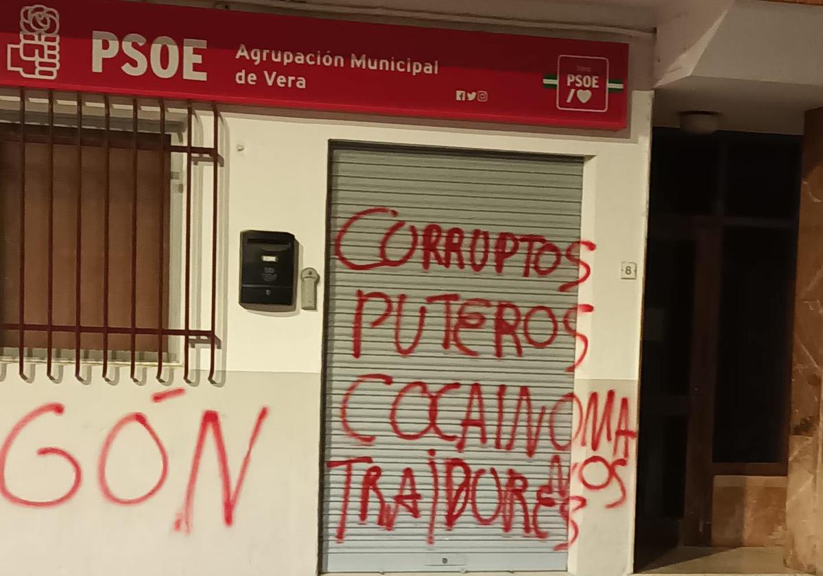 La sede del PSOE en Vera volvió a amanecer este lunes con pintadas ofensivas como «corruptos», «puteros», «cocainómanos» o «traidores». Se trata de la tercera ... vez que vandalizan este local.