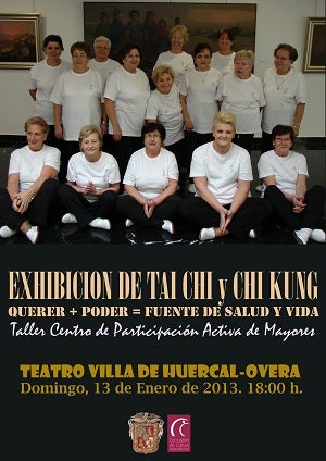 El próximo domingo, 13 de enero, el Teatro 'Villa de Huércal-Overa' acogerá una exhibición de Tai-Chi y Chi Kung 'Querer+poder=fuente de salud y vida'. Será a las 18:00 horas y participarán alumnas del taller de esta actividad del Centro de Participación Activa de Mayores.