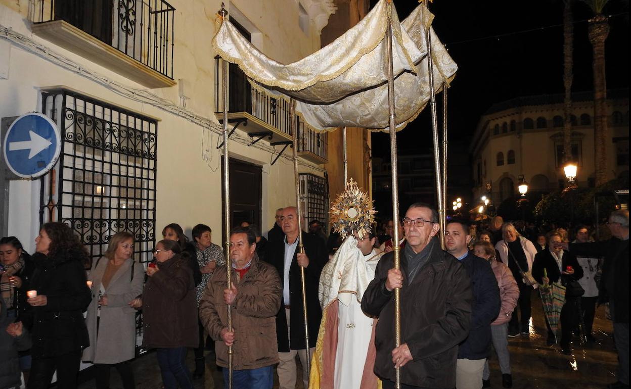 Rememora el traslado, en 1739, del Santísimo a la Iglesia Parroquial, desde su antiguo emplazamiento en la carretera nacional al actual en pleno centro